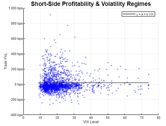 Let’s start with Q1. We ran a simple linear regression between the PnL (in basis points) of each short trade and the average VIX level on the same day. Contrary to common belief, we found no significant relationship between VIX and short trade profitability. This is visually confirmed by the flat black line representing the fitted linear relation. Additionally, a p-value of 0.91 for the beta reinforces this conclusion.