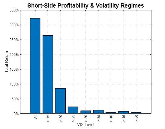 The next bar chart shows the total return of all short trades, conditioned on the VIX being above a certain threshold. In other words, how much money did short trades generate if we only traded when the VIX was sufficiently high? This chart further confirms the regression results: limiting short trades to high volatility environments does not benefit overall compounded performance.