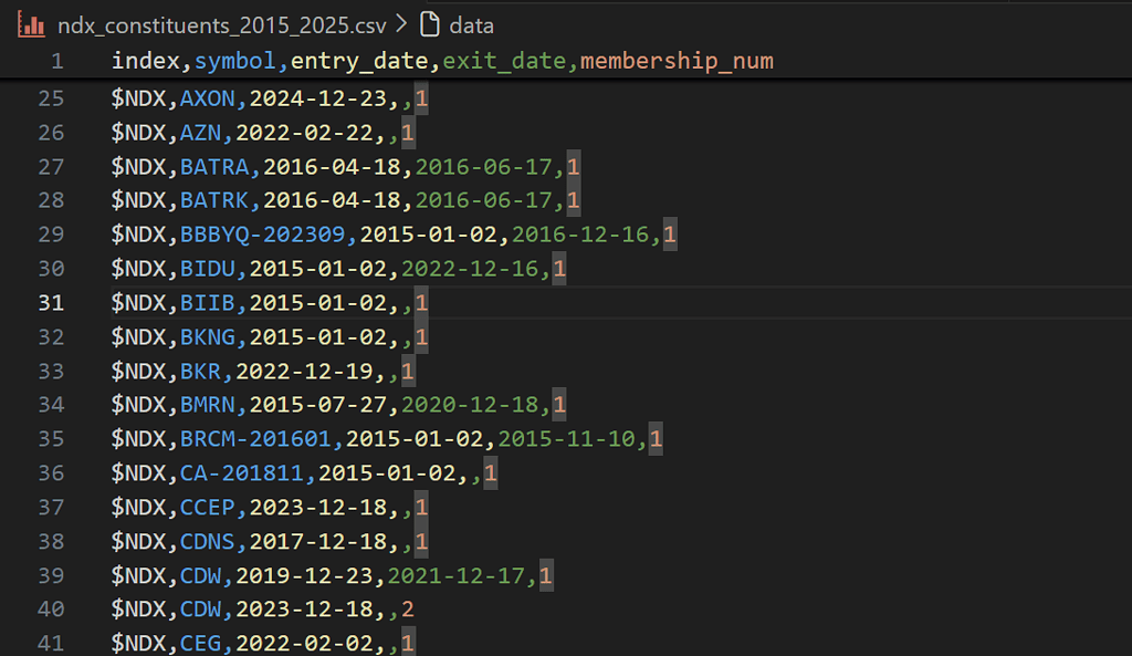 In this article, we constructed a point-in-time index constituency database using Python and Norgate Data. By explicitly tracking index entry dates, exit dates, and multiple re-entries, we eliminate a common and often overlooked source of survivorship bias in index-based backtests.